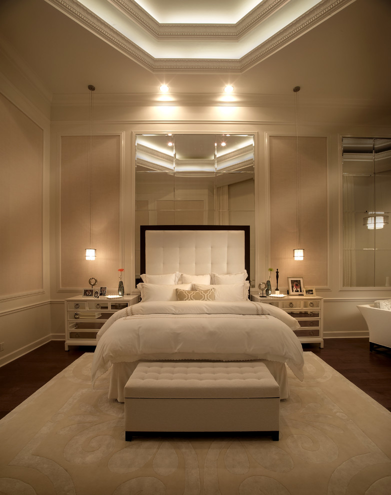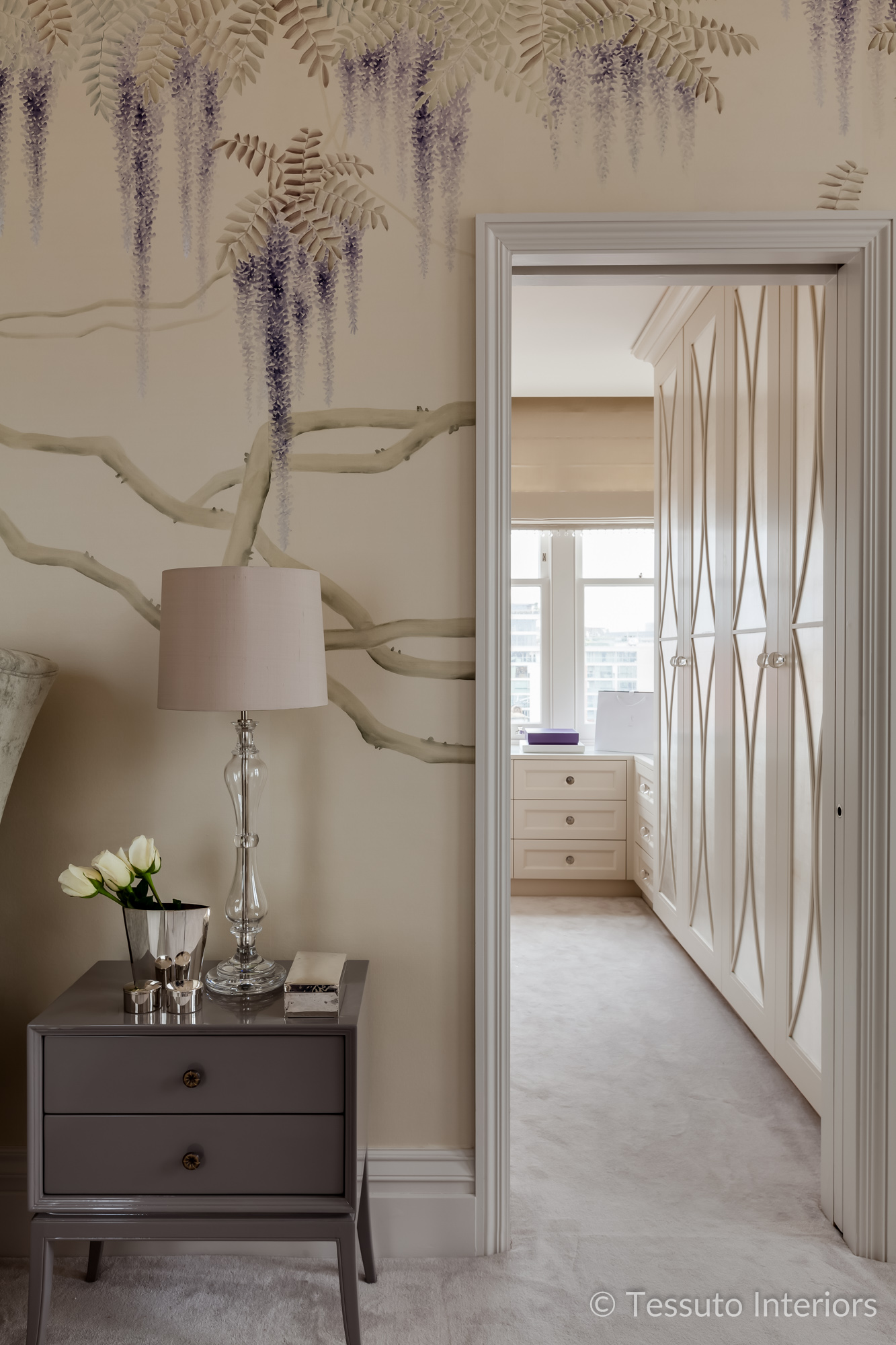 This is a classic, feminine bedroom in cream. The panelling, sconces on either side of the bed, continental mirroring, and time-honoured headboard work together to create a true retreat from the world. I am intrigued by the carefully selected personal objects on the bedside tables, which I see include a sculpture and a bright blossom; exquisite.